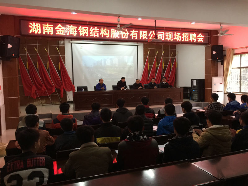 2015年12月9日,湖南金海钢结构股份有限公司一行5人在曾副董事长的带领下来到我校进行现场招聘。湖南金海钢结构股份有限公司于1999年12月13日注册成立的民营企业——湖南金海钢结构股份有限公司,公司现位于湖南省湘潭市九华经开区金海路1号。公司是一家专注于建筑钢结构产业发展及其关联产业研发与探索的现代化企业,已取得国家房屋建筑总承包一级资质、钢结构制造特级资质、钢结构专项设计 甲级资质,是中国建筑钢结构定点制作与安装企业,中国钢结构住宅产业化基地示范企业,全国钢结构行业综合实力排名第17位,湖南省内行业领先企业,公司是中国建筑金属结构协会钢结构分会副会长,湖南省钢结构行业协会会长单位。